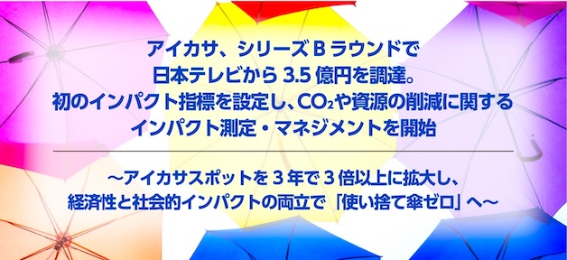 “⾬の⽇も晴れの⽇も快適にハッピーに“と”使い捨て傘をゼロに“をミッションに掲げる傘のシェアリングサービス「アイカサ」を運営する株式会社Nature Innovation Group(以下アイカサ)は、シリーズBラウンドにて、⽇本テレビホールディングス株式会社(以下、⽇本テレビ)を引受先とした3.5億円の資⾦調達(ファーストクローズ)を実施。