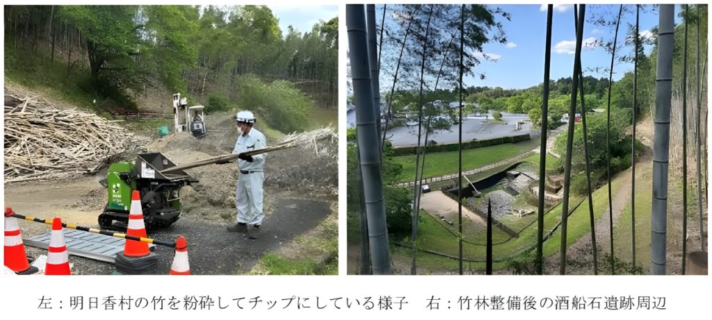 同社は奈良県明日香村と2017年9月に「官民連携に関する包括協定」を締結し、2018年より「企業版ふるさと納税」制度を通じた様々な地域支援を行ってきた※3。放置竹林による竹害問題の解決に貢献する竹林整備事業においては、伐採した竹を処分する必要があるが、竹チップに加工して建設現場で再利用することで、竹害問題の解決に貢献するとともに、セメント系固化材の使用料削減によるCO2排出を抑え、竹の生長過程で吸収したCO2を地中に固定するなど環境負荷の軽減が可能になる。