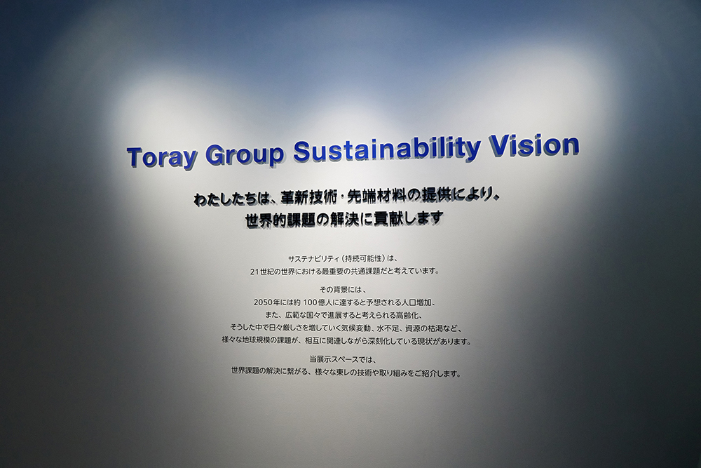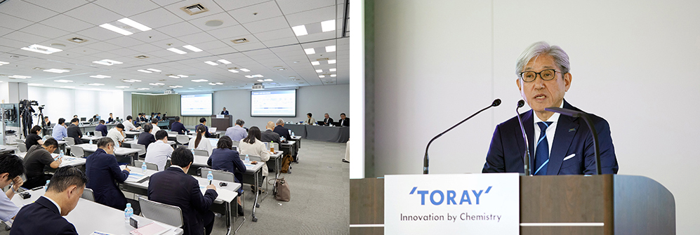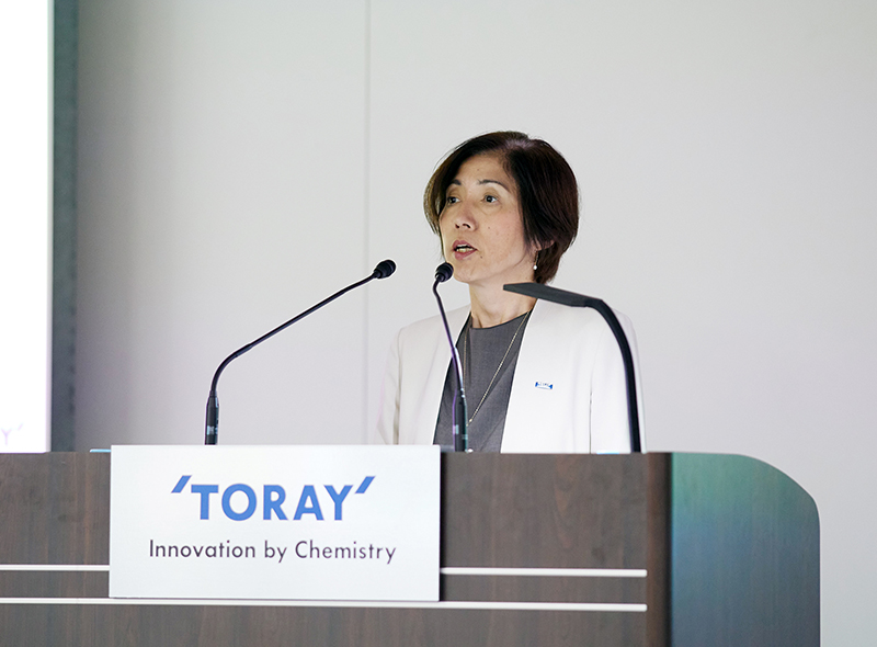 まず、社会の公器である企業が事業を通じて社会に貢献するという経営思想や経営基本方針、そして「私たちは新しい価値の創造を通じて社会に貢献します」との企業理念のもと、2018年に「東レグループ サステナビリティ・ビジョン」を策定し、活動を継続していることを紹介。事業を通じた社会への貢献の拡大と、自社の環境負荷低減への取り組みは、相互に好循環を生み出し、経済的価値と社会的価値の向上につながっていると伝えた。