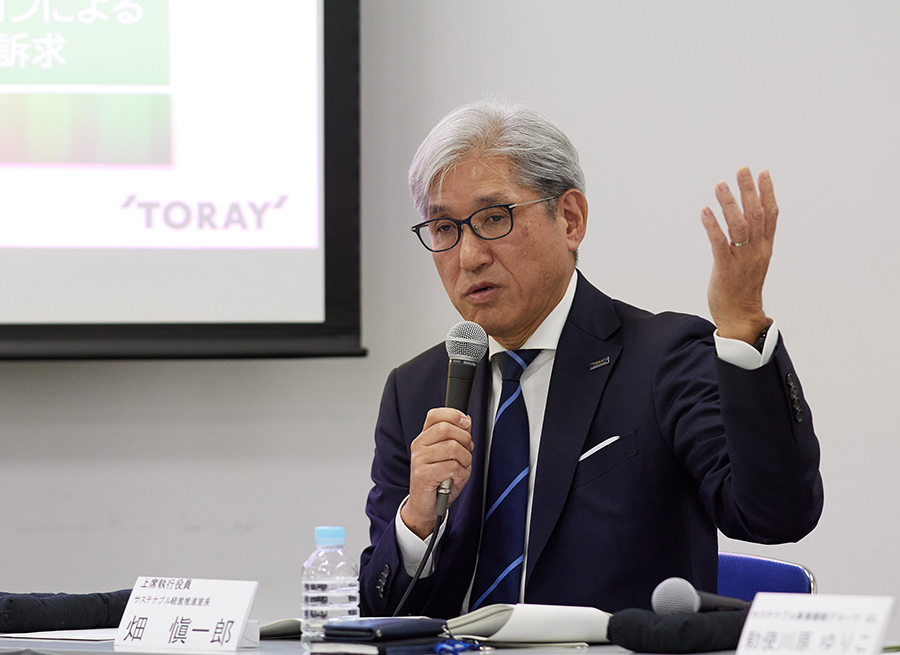 東レグループのサステナビリティへの取り組みに関する説明会「IRセミナー」が、9月3日に行われた。最初に、上席執行役員でサステナブル経営推進室長の畑愼一郎氏が登壇し、サステナビリティに対する企業としての基本的な考え方に触れた。