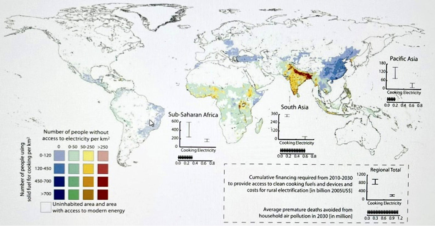 (注)近代的な調理設備および電力へのアクセスを持たない人口の世界的分布と、2030年までに農村部の完全な電化と近代的な調理手段の普遍的アクセスを達成するための累積コストの推計、さらに2030年に回避される死亡者数を示している。