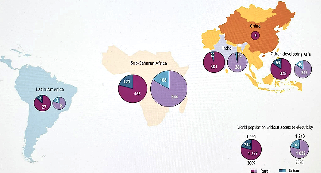 国際エネルギー機関(International Energy Agency;以下IEAと略)の調査[2]によると、電力を使えない人々は世界に約10億人。ガスなど電力以外のエネルギーまで含めると、14億人が近代的なエネルギーのない生活をしているといわれている。