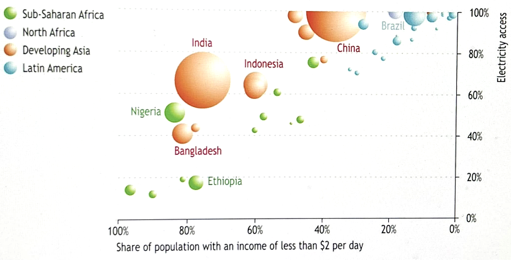 その60%はサハラ以南アフリカ、17%はインド、その後はバングラデシュ、インドネシア、ミャンマーなどアジア地域が続き、開発途上国が未電化人口の9割以上を占める。