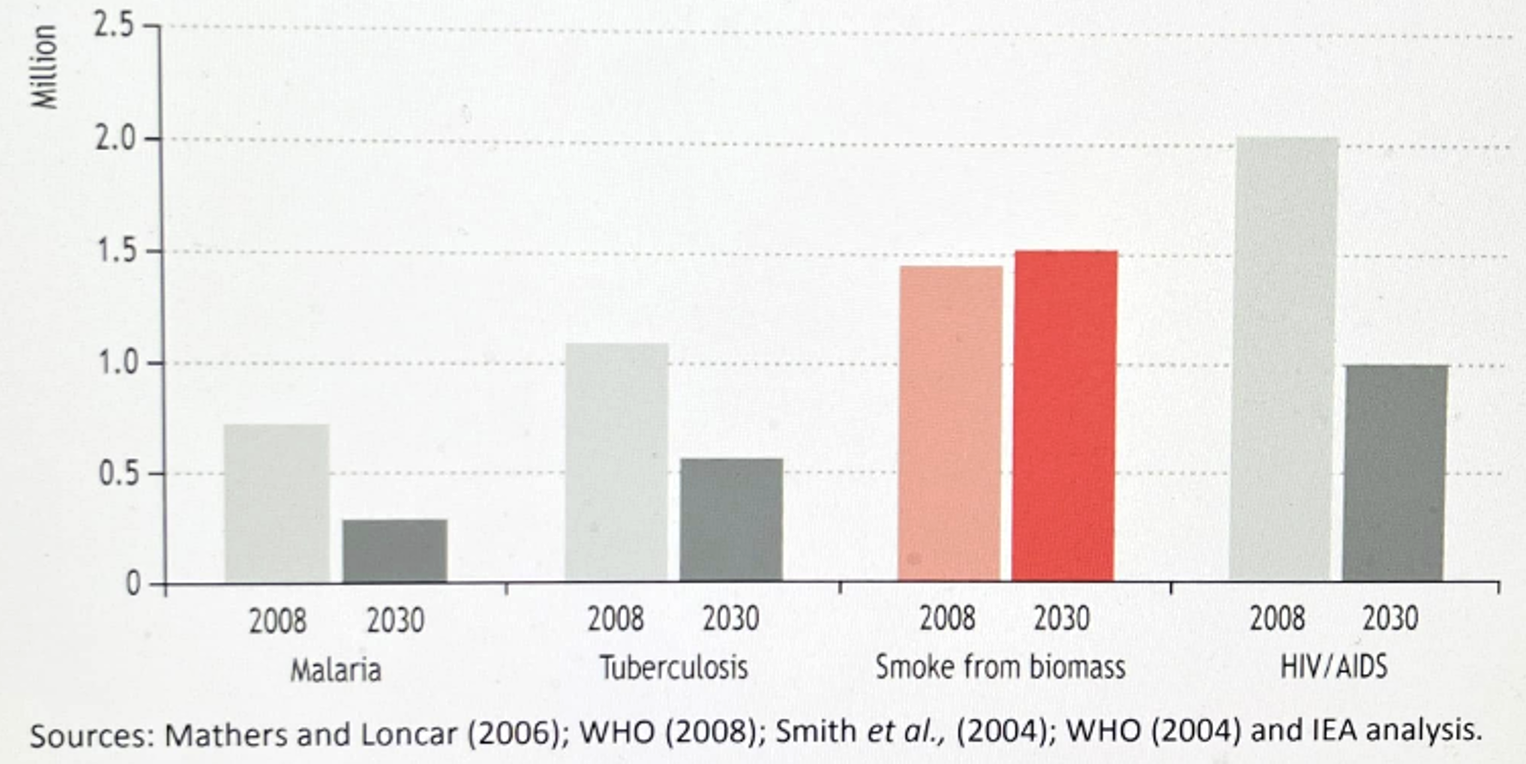 (注)赤は、薪や炭などの伝統的な燃料に頼る生活による屋内空気汚染や健康被害による死亡人口は、2008年より2030年には増加する見通しである。