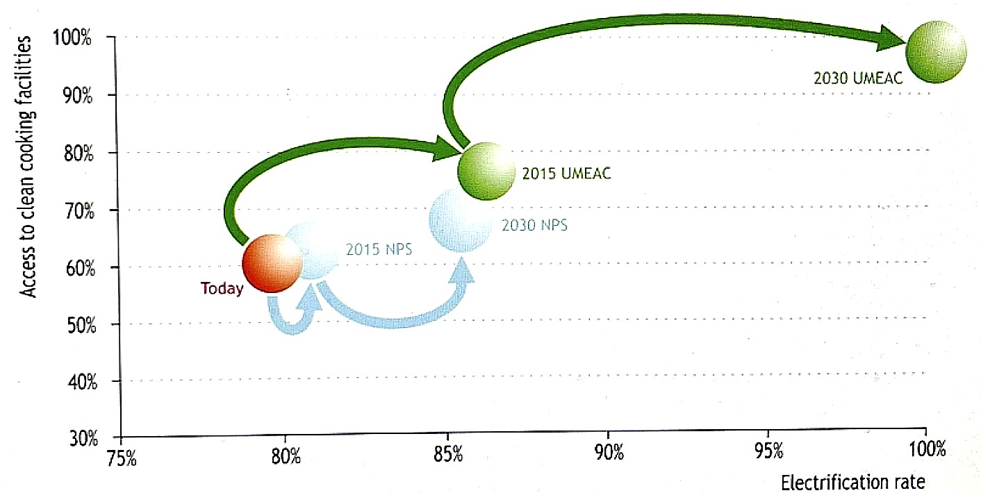 provided with access to clean cooking facilities. These are demanding targets in the New Policies Scenario they are not achieved even in 2030. the UMEAC calculates what