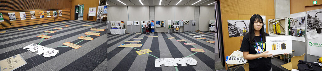 「サステナブル人生ゲーム」では、自身のサステナブルに対する取り組みなどの問いに答える人生ゲームを体験しながら、株式会社三栄コーポレーション(以下、三栄コーポレーション)が社会のサステナブル活動を主導・支援する「OUR EARTH PROJECT」の7ブランドの取り組みが楽しく理解できる展示を実施。裁断時の端切れを元に生地をつくることで染色の必要がなく、大量の水を使わずに服をつくる「Pure Waste」や、廃棄されるはずだった自動車のエアバッグ、シートベルト、ベルトのバックルを再利用してバッグを製造している「AIRPAQ」など、野心的な取り組みがゼミ生の解説とともに紹介された。