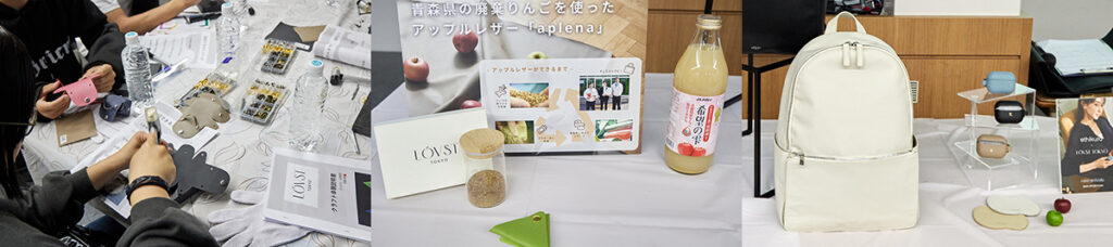 「レザーワークショップ」では、廃棄リンゴから生まれた「アップルレザー」を展開するラヴィストトーキョー株式会社(以下、ラヴィストトーキョー)の共創型ブランド事業「LOVST TOKYO」と産学連携。オリジナル刻印入りレザーアイテムづくりを行い、石油由来の素材ではなく、リンゴジュースの搾りかすから革小物が生まれる過程の一部を、子どもから大人まで体験していた。