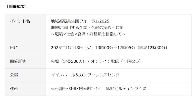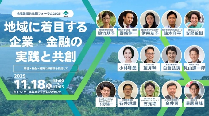 環境省では、「地域に着目する企業・金融の実践と共創~環境・社会・経済の好循環を目指して~」(https://business.form-mailer.jp/lp/687b4b77309401)と題し、11月18日(火)13時~イイノホール&カンファレンスセンターにてフォーラムを開催する(オンライン配信あり・会場参加者のみ交流機会あり)。