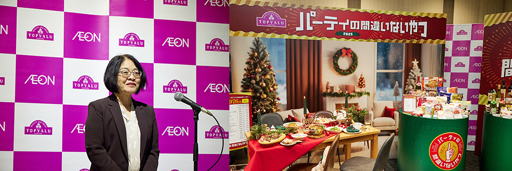 登壇したイオントップバリュ株式会社 代表取締役社長・土谷美津子氏は、「2025年度クリスマス・年末年始の取り組みについて ~物価高でもがまんせず、トップバリュで心あたたかく。~」と題してプレゼンテーションを行った。