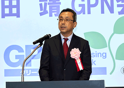 最初にGPN 会長であり審査委員長を務める梅田 靖氏が挨拶。今回の総評を行った。梅田氏は今年度が、顧客やステークホルダーへ情報発信することによる啓発効果と取り組みへの共感の獲得、共感を得やすくするためのストーリーデザインに趣向を凝らしている点が特徴的だったと述べ、新たなビジネスを興そうとするスタートアップや、業界の環境配慮を底上げするために次世代を育成する取り組みも見られたことに触れた。また、原材料調達におけるリスク対策をサポートする調達の事例は、原料産出地への向き合い方のヒントとなり、環境マネジメントシステムの中にグリーン購入を位置付けたり、近隣の他団体と連携して共同調達を行ったりする事例は、効率的にグリーン購入に取り組む知恵と、まだ十分に取り組めていない地方自治体へグリーン購入を広げるポテンシャルがあることを示したと話した。