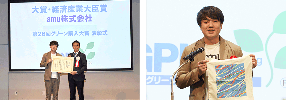 大賞・経済産業大臣賞を受賞したamu 株式会社株式会社からは、代表取締役 CEO加藤広大氏が登壇。amu 株式会社は、「いらないものはない世界」の実現をビジョンに掲げ、耐用年数を終え使用済みとなった漁具が環境負荷をもたらし、その処分が漁業者にとって経済的負担になっている状況を踏まえ、使用後の 漁具を漁師から買取り高品質の素材に再資源化する事業を展開してきた。漁具の回収から素材・製品開発、流通まで一貫したサプライチェーンを構築し、トレーサビリティも確保に努めてきた。そして、これまで 30 を超える都道府県の漁港を巡り、現地の漁業者との関係構築や漁具回収に関する相談を行った結果、見込み回収量は約 100 トンに達している。また、素材の品質や透明性を保証する「amuca®タグ」を提供し、QR コードを読み取ることで、どの地域で回収した廃漁具を使用しているかを見える化し、集積地域、漁具提供者、回収量などをその場で伝える取り組みを実施している。今回は廃漁具の回収から製品製造・販売まで行うシステムの構築に加えて、地域との結びつきを重視し、製品のQR コードから「物語」を発信することで、消費者に対して価値を伝え、海洋プラ問題への意識変革の促進につなげている点が評価された。山本氏はスピーチで環境に対する様々な取り組みがただ「環境にいい」ではなく、「おもしろい」といった直感的なものが大きく影響し、今回受賞した使用後の漁具を漁師から買取り高品質の素材に再資源化する事業についてもイベントで発せられた4歳の女の子の「かわいい」という言葉が後押しになったと述懐した。そして、今後もそういったストーリーを紡ぎながら、コラボレーションを広げたいと話した。