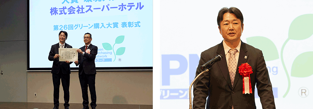 大賞・環境大臣賞を受賞した株式会社スーパーホテルからは代表取締役社長 山本 健策氏が挨拶。同社は2010 年より、公式ホームページ経由の予約および Premier 店舗の利用室分を 対象に、宿泊に伴う CO2 排出量(Scope1、2 相当)をカーボン・オフセットする「ECO 泊(エコ泊)」を提供。2024 年 10 月からは、対象範囲を全ての宿泊に拡大し、「CO2 実質ゼロ泊」のサービスを開始した。宿泊時のガス・水道の使用による CO2 排出量は 100%カーボン・オフセットし、電力消費に関しては電力会社の CO2 フリープランや非化石証書を活用して全ての宿泊施設で再生可能エネルギー由来のグリーン電力を使用。2025 年 3 月までの「ECO 泊」および「CO2 実質ゼロ泊」の宿泊数は 延べ約 2,959 万泊となっている。受賞では長年継続的に実施されてきた ECO 泊の取り組みを、全ての宿泊に対象を拡大したことが、評価された。山本氏は2000年から熊本県水俣市から始まった環境活動を振り返り、今回受賞したホテルに泊まるだけで環境保全につながる「CO2 実質ゼロ泊」が現場スタッフはもとより、賛同いただいたお客様の存在があってこそ成し得たことを強調。小さなグリーン選択の積み重ねが大きな未来社会の形成というものにつながっていくと述べた。
