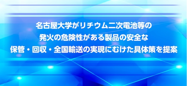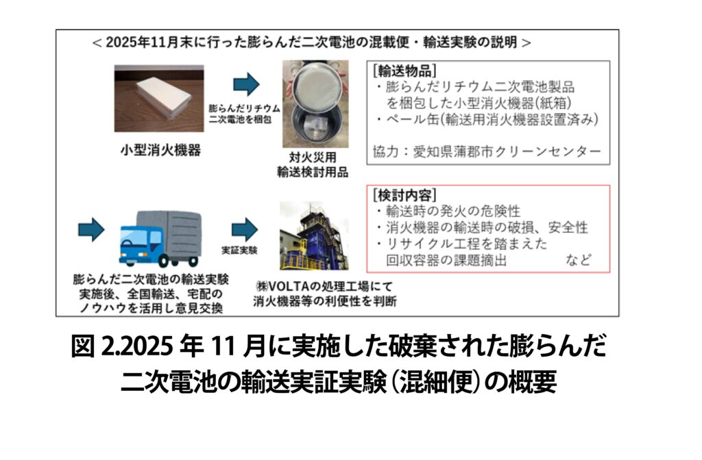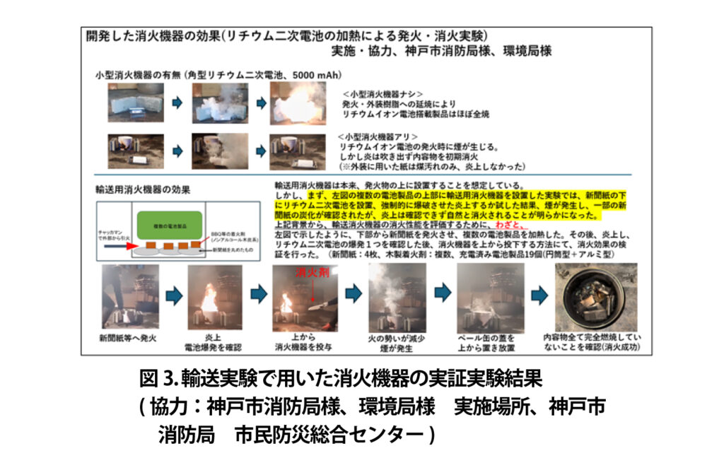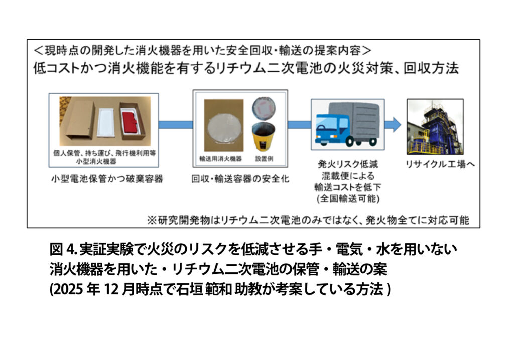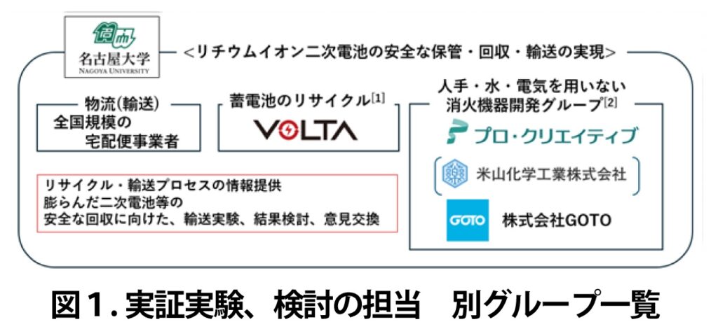 国立大学法人東海国立大学機構 名古屋大学大学院工学研究科 石垣 範和 助教、人手・水・電気を用いない形状自由な消火機器開発グループ、全国規模の宅配便事業者・リサイクル業者である株式会社VOLTAが連携し(図1)、リチウム二次電池(モバイルバッテリー、リコール品、ポータブル電源(大型蓄電池)など)のサイズに応じた安全な全国輸送実現にむけ、廃棄された膨らんだリチウム二次電池を利用した安全な回収方法及び輸送方法の実証実験を行い、社会実装に向けた具体策の検討を行っている(図2、図3)。