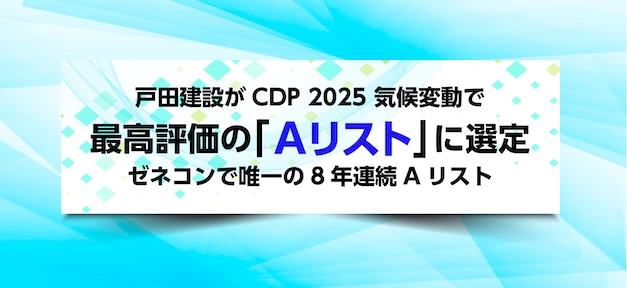 戸田建設は、環境評価を行う国際的な非営利団体CDP(本部:ロンドン)から、最高ランクの「CDP 2025気候変動Aリスト」に選定され、気候変動に対する活動と情報開示において世界的な先進企業として評価を受けた。これは2018年以降、ゼネコンで唯一の8年連続での気候変動Aリスト企業となる。