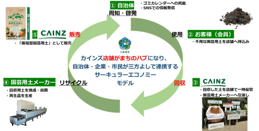 メーカー様には焼成・殺菌技術によって、安心して使える品質であり、かつ他社製品と比較しても生育スピードが早い高品質な再生土を生産していただきました。自治体様には広報誌やホームページによる周知・啓発によって信頼性を担保していただきました。そして我々カインズとしては、お客様が回収拠点として買い物ついでに不用となった園芸用土を気軽に持ち込めるよう、店舗が地域のサーキュラーステーションの役割を担ったのです。このように役割分担を明確にしたことで、より循環可能なシステムとして稼働させることができました。