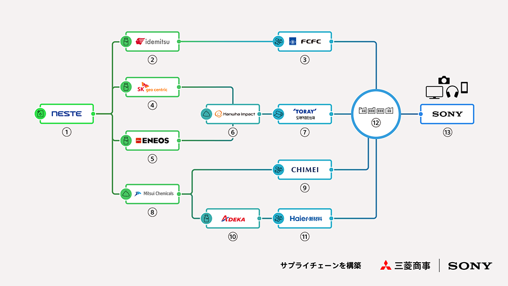 ① Neste Corporation:リニューアブルナフサを製造 / ② 出光興産株式会社:リニューアブルスチレンモノマーを製造 / ③ Formosa Chemicals & Fibre Corporation:リニューアブルポリスチレン樹脂を製造 / ④ SK Geo Centric Co., Ltd.:リニューアブルパラキシレンを製造 / ⑤ ENEOS株式会社:リニューアブルパラキシレンを製造 / ⑥ Hanwha Impact Corporation:リニューアブルテレフタル酸を製造 / ⑦ Toray Advanced Materials Korea Inc.:リニューアブルPET 樹脂と原反を製造 / ⑧ 三井化学株式会社:リニューアブルビスフェノールA を製造 / ⑨ CHIMEI Corporation:リニューアブルポリカーボネート樹脂を製造 / ⑩ 株式会社ADEKA:リニューアブル難燃剤を製造 / ⑪Qingdao Haier New Material Development Co., Ltd.:リニューアブルポリカABS 樹脂を製造 / ⑫ 成形メーカー / ⑬ ソニー株式会社:デザイン・製品化