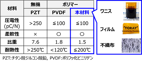 近年、モビリティ、ロボット、産業機械、航空・宇宙機などの分野において、振動検出・監視センサーのニーズが広がっている。自動車分野では、ロードノイズを抑制するためのアクティブノイズキャンセリング(ANC)4)、ロボット分野では触覚としての振動検出、産業機械や航空・宇宙機の分野では、振動を常時監視し、異常を早期検知する振動監視5)の導入が検討されている。これらの分野では、広範囲にわたる振動を正確に把握する大面積での搭載が必要。また、モーター・エンジン周辺での使用や宇宙環境、熱媒配管などの用途では、100℃を超える高温環境での圧電性能が求められている。同材料は、東レが培ってきたポリマー分子設計技術と高次構造6)制御技術を駆使して開発した、高い圧電特性を備えた新規ポリマー材料であり、分極構造が200℃以上でも維持されるため、PVDFでは対応できなかった高温環境下で安定した検出を実現する。また、ワニスやフィルム、不織布などの形状で提供できるため、複雑形状や大面積のセンサーにも適用可能となる。