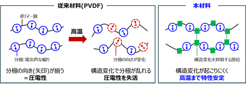 圧電材料とは、外部から力(応力や振動)を加えると電圧を発生する材料で、マイクや歪みセンサー2)などに使用。主に、ポリフッ化ビニリデン(PVDF)やチタン酸ジルコン酸鉛(PZT)が用いられているが、PVDFは120℃で分極構造3)を失い圧電性が喪失するため、使用温度の上限は80℃程度。また、PZTなどの無機圧電材料は、圧電性が高い一方で硬く脆いため、複雑形状や大面積での搭載が困難だった。