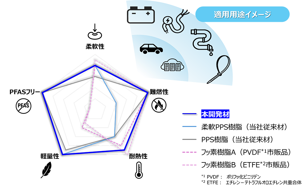 2026年1月より、バッテリー周辺部材や半導体製造装置部材用途などにおいて、顧客向けに有償サンプルの提供を開始した。2026年度中に量産体制を構築するとともに、PFAS規制への対応と高機能化を両立しつつ、既存の設計技術が適用可能な次世代材料として、xEVやデータセンターの冷却配管、固定具、バッテリーやインバータの周辺部材、さらに産業配管や結束部材など、高温・高信頼性が求められる幅広い用途に展開していく。