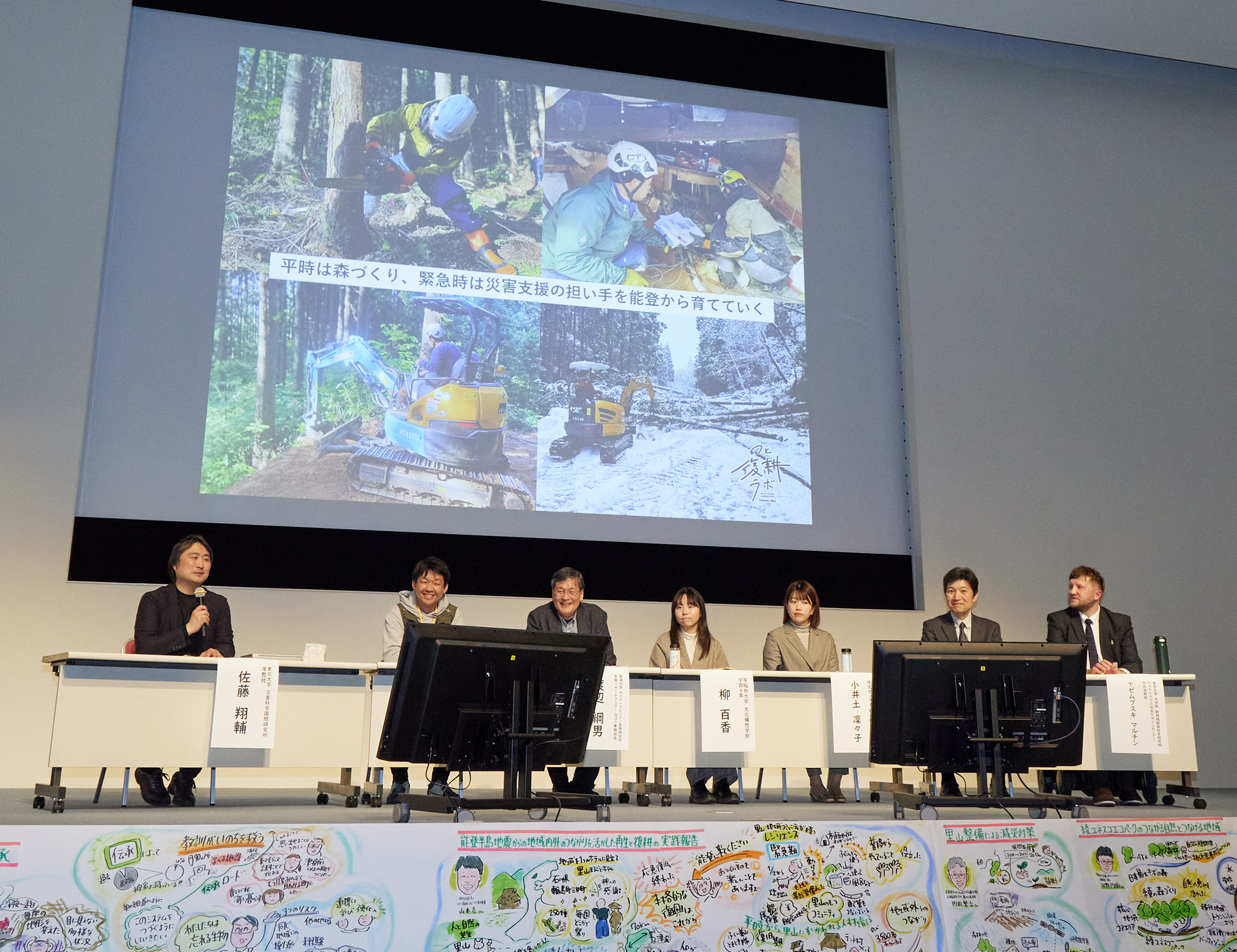 その後、「里山・地域コミュニティがもつレジリエンス」をテーマにパネルディスカッションが実施された。ここでは、東北大学災害科学国際研究所准教授の佐藤翔輔氏をモデレーターに、京都大学フィールド科学教育研究センター特定研究員の小井土凛々子氏、基調講演を行った山本亮氏、そして活動報告を行った4名が登壇。それぞれの活動現場を紹介しながら、里山・地域コミュニティがもつ可能性について多角的な議論が交わされた。