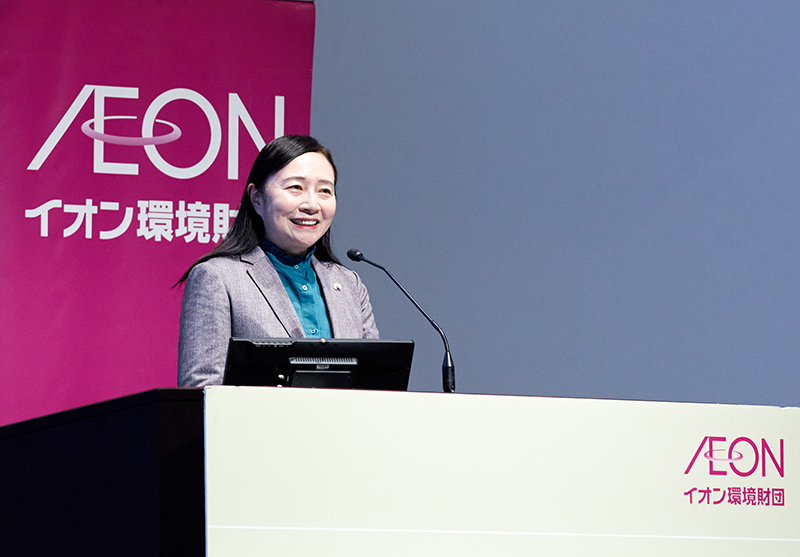 開会にあたり、イオン環境財団専務理事山本百合子氏が挨拶。同財団の歴史を振り返りながら、その活動の特徴が地域のボランティアのメンバーといっしょになって行うことであることを強調した。また東日本大震災など被災地に注力した植樹活動を展開してきた事例を紹介し、同財団が目指す里山が現代社会にマッチし、ユース世代も活動しやすいサステナブルな里山をつくるところにあると語った。