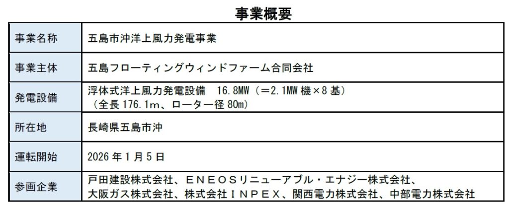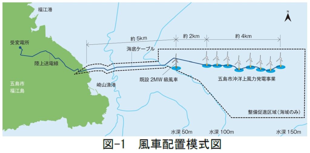 五島洋上ウィンドファームは、海洋再生可能エネルギー発電設備の整備に係る海域の利用の促進に関する法律に基づき、経済産業大臣及び国土交通大臣から公募占用計画の認定を受けた国内第1号の案件であり、複数機設置する洋上風力発電所としても国内初となる。