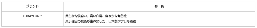 2つ目の取り組みとして注目したいのは、アクリル短繊維ブランド「TORAYLON™(トレロン)」について、海外市場への提案力強化を目的とした、機能や用途に応じたサブブランドの立ち上げ。今後は、TORAYLON™が持つ柔らかな風合いと鮮やかな発色性の特長を活かし、消費者が求めるさまざまな機能や用途に対して機能軸で整理された高機能素材をわかりやすく提案することで、海外市場での訴求力を高めていく。