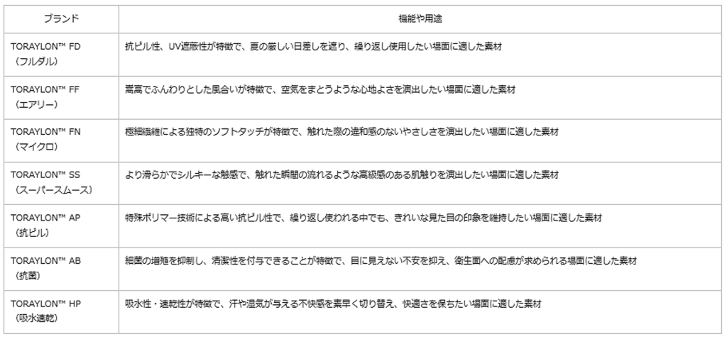 TORAYLON™をマザーブランドとして位置付け、機能特長を示すアルファベット2文字のサブブランドを新たに定義した。これにより、素材特長を一目で把握でき、用途別の素材選定をより容易にする。これらのサブブランドは、日本生産による品質の安定性を前提に、TORAYLON™の特長を機能別に整理したものとなる。