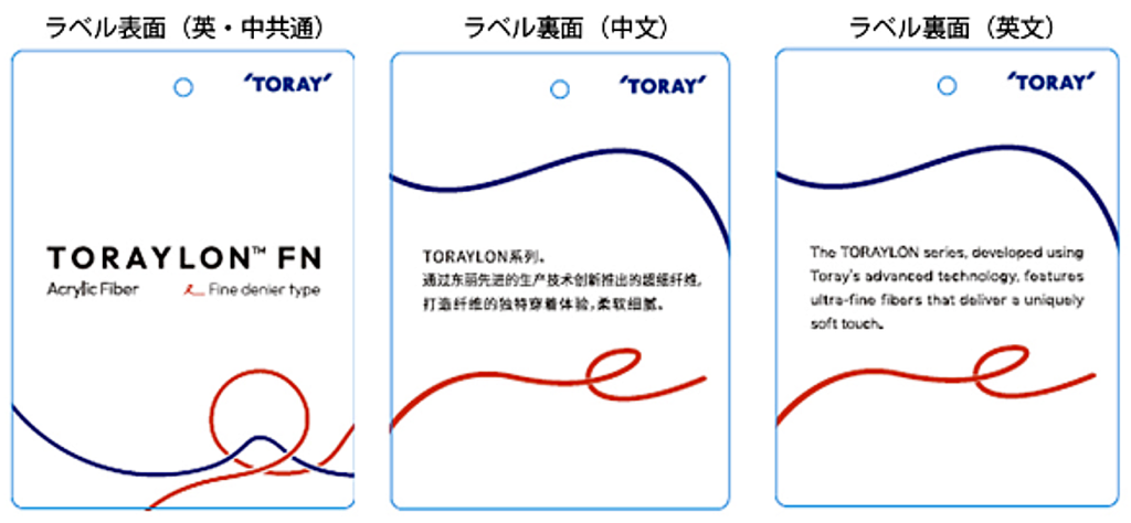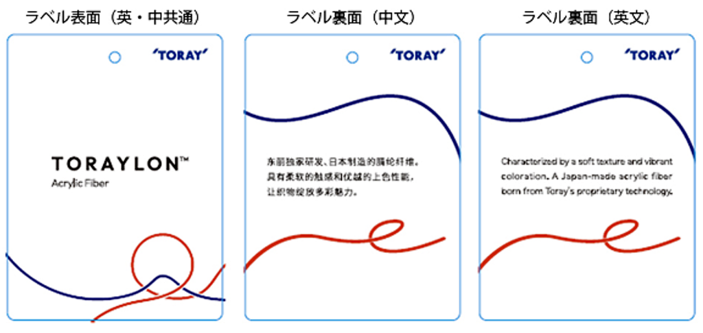 同取り組みにあわせて、海外向けラベル(下札)デザインを刷新。サブブランド名と機能特長を視覚的に分かりやすく表現することで、海外市場においてもTORAYLON™の価値が直感的に伝わるコミュニケーションを実現する。