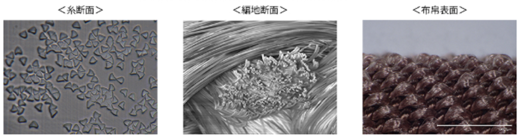 (2)同開発品は、収縮特性ならびに光沢感の異なる2種類の原料を使用することで、マイクロファイバーが生み出す上質な微起毛感とソフトタッチな風合いに加え、膨らみ感や複雑な乱反射が生み出すレーヨンのような上品な光沢感を発現しつつも、ポリエステル由来のイージーケア特性をも併せ持つ、新たなポリエステル長繊維となる。