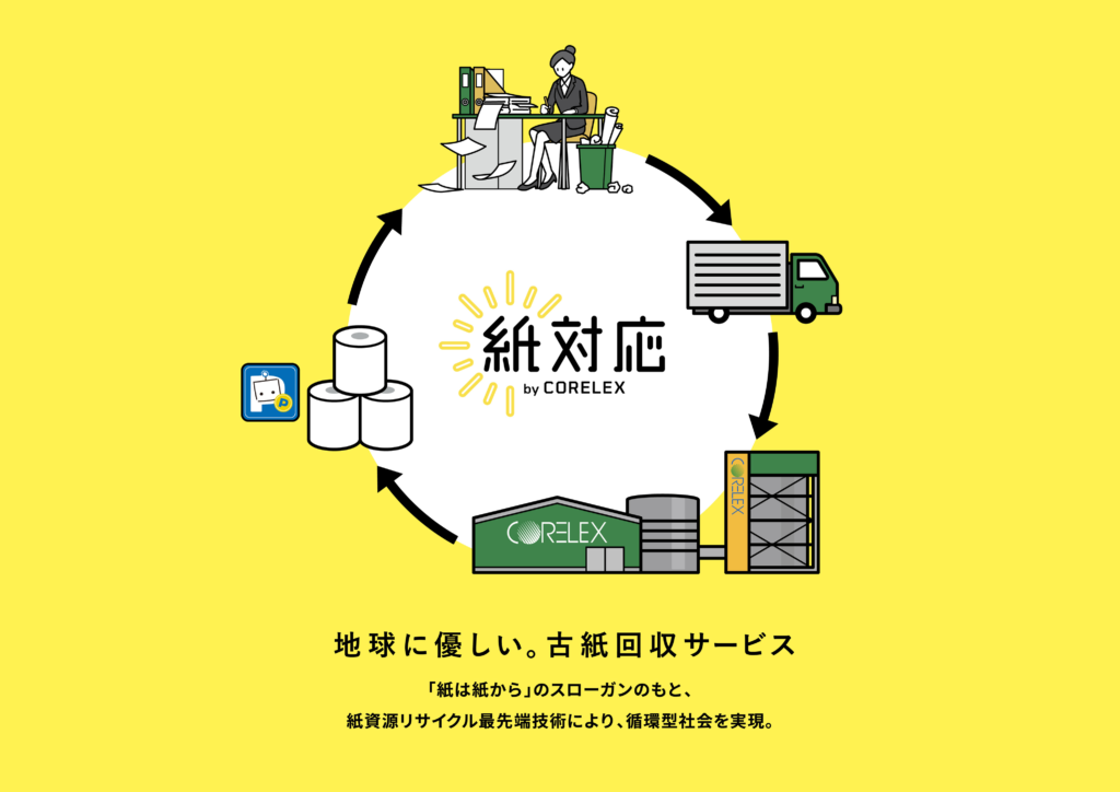今回導入する「紙対応」は、キャンパス内で発生する紙資源をコアレックス信栄が回収・溶解し、トイレットペーパーなどの生活必需品へリサイクルする仕組みとなる。同社の特殊な溶解技術により、ホチキスやクリップ、バインダーの金具が付いた状態の紙や、従来はリサイクルが困難とされていた難再生処理紙も、分別不要で溶解・再生することが可能。また、温水で溶解しリサイクルするため焼却処分と比べ、CO2排出量の大幅な削減にも貢献できる。