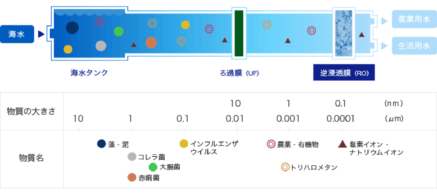 従来、海水淡水化は、石油などの燃料を燃やし海水を蒸発させて塩分を取り除く「蒸発法」によって行われてきた。しかし、蒸発法は大量のエネルギーを消費するとともにCO2の排出量を増加させてしまう。東レは、海水を蒸発させず特殊な膜を使って塩分を取り除く「逆浸透膜」を開発した。水だけを通す膜で仕切った容器の片方に真水、もう片方に物質を溶かした水溶液を入れると、両方の濃度を同じにするように水だけが濃度の高い方に移動し、その結果片方の水面が上昇する。その水面に圧力をかければ上昇を止めることができるが、その場合の圧力を浸透圧と呼ぶ。逆に、浸透圧以上の圧力を水溶液にかければ、溶けた物質が取り除かれた真水が膜を通して得られる。これが逆浸透膜の原理である。